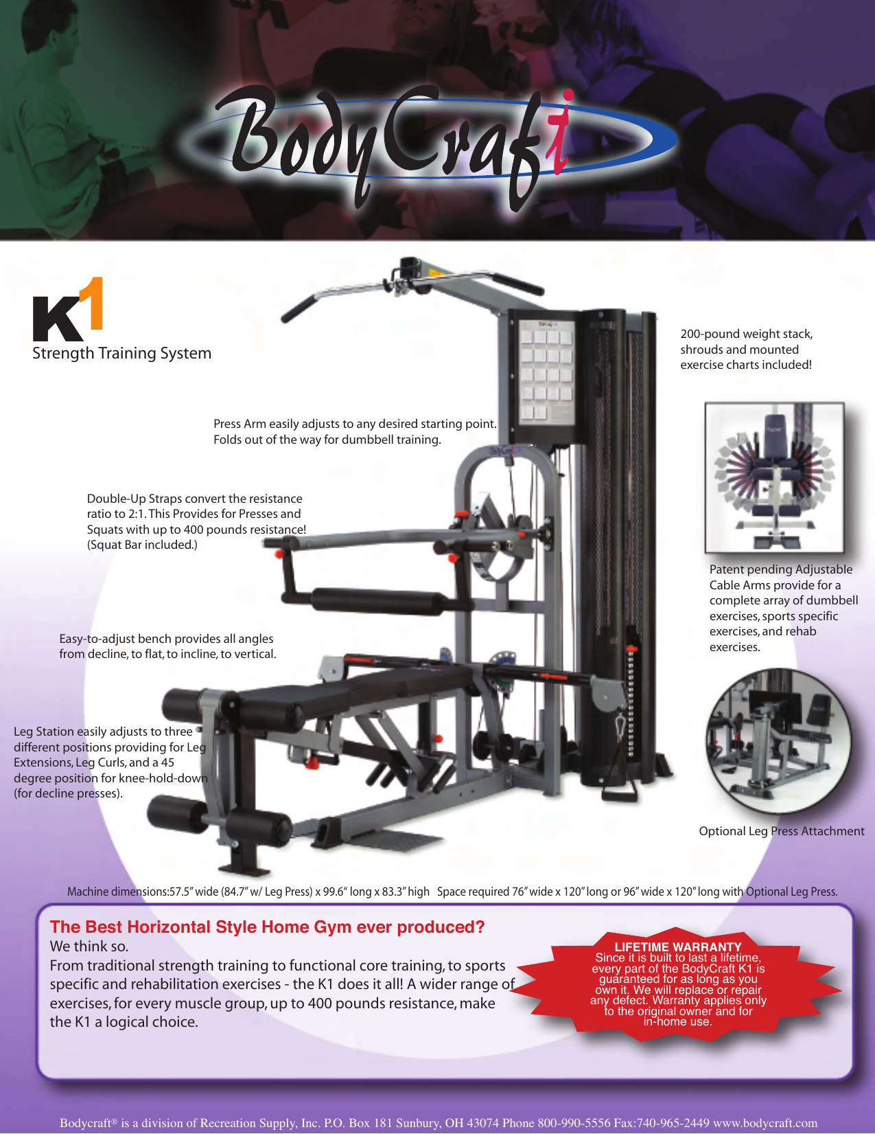 A wider range of exercises for every muscle group up to 400 pounds resistance make the K1 a logical choiceFrom traditional strength training to functional core training to sports-specific and rehabilitation exercises the BodyCraft K1 home gym does it all. While people are very likely to do cardiovascular exercises and may even buy a stair stepper or treadmill to help them lose weight they often seem to forget that their bodies need to be toned as well. Each of our machines provides you with a unique mix of exercises that can be incorporated into your workout.